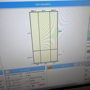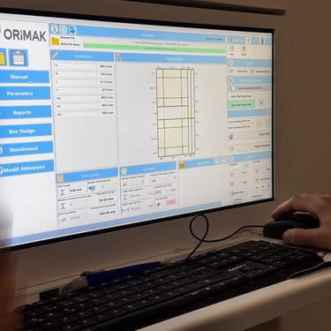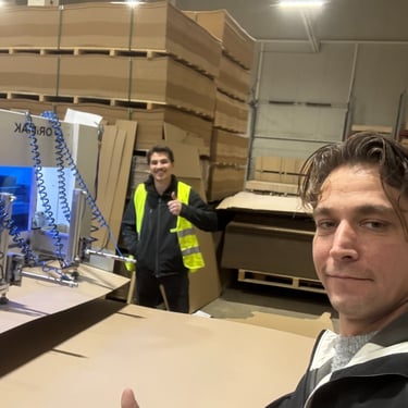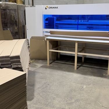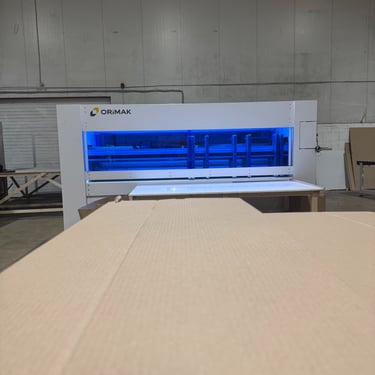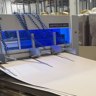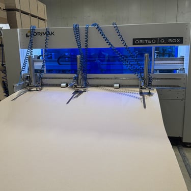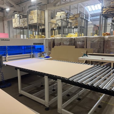 Sumontuota pirma projekto "sofų kartoninių pakuočių" gamybos linijos dalis. Buvo instaliuotos dvi skirtingos Orimak Qs-box versijos, viena su tiesiniu konvejeriniu lapų padavimu į pjaustyklę ir antroji versija su pakrovimu nuo paletės. Tai tik pirmas etapas į pilnai automatizuotą pakuočių gamybos projekto konceptą. Dar laukia spaudos mašina, apie kurią šiek tiek vėliau.